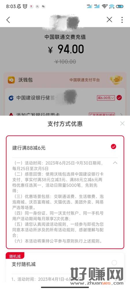 联通建行支付满88减6 可购买充值卡 润10.2r