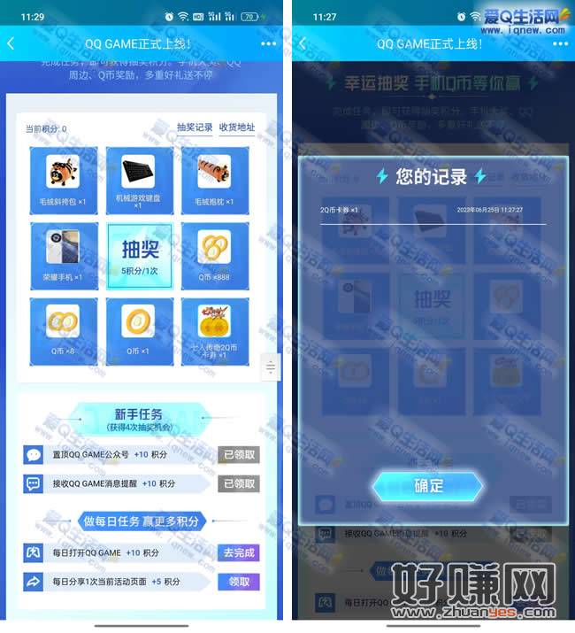 手Q打开下方地址 完成任务领取积分 5积分可以抽奖一次 非必中