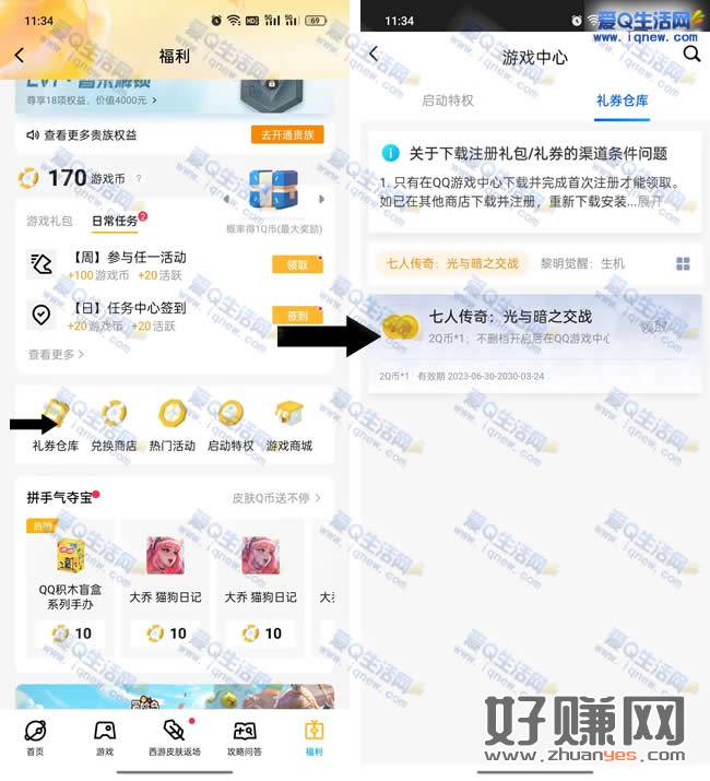 游戏上线后在QQ下载注册 领取 路径-QQ搜索【QQ手游】-右上角【游戏手柄】图标-底部右下角【福利】-【礼券仓库】兑换领取