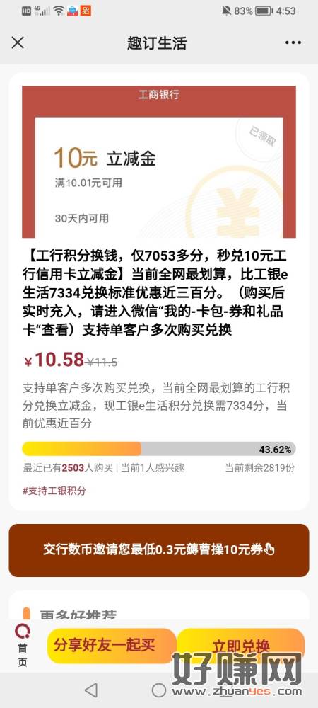 限量特惠100份!工行积分只需7053分即可兑换微信10元立减金!