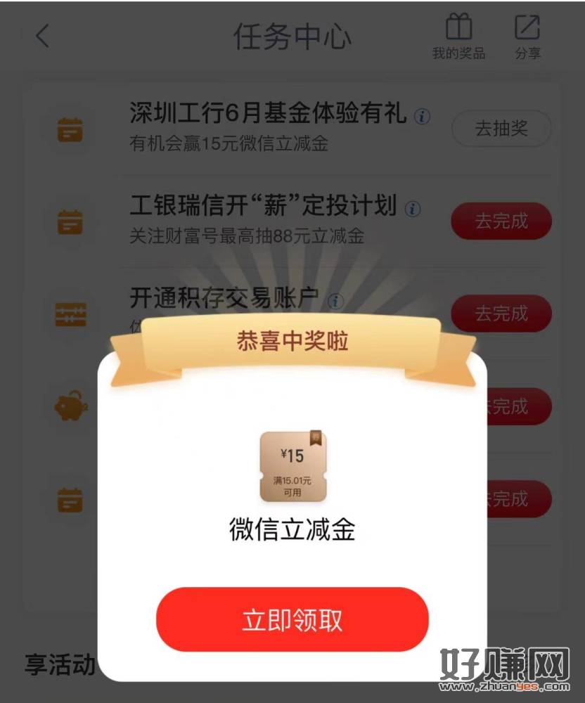 深圳工行任务中心买一元基金抽奖,好像必中15元