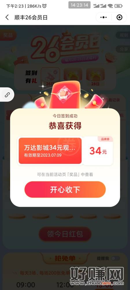 顺丰小程序左上角26号会员日 点进去给34元的万达电影票 可