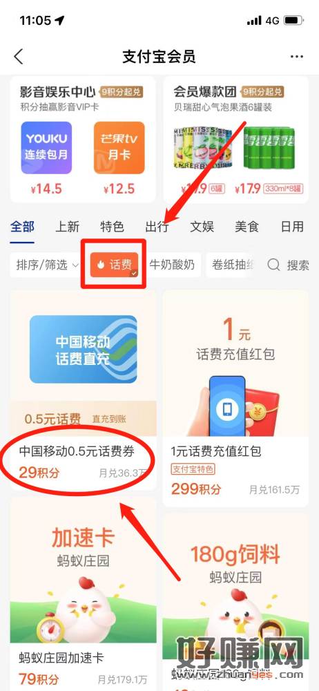 我的-支付宝会员-话费-29积分兑换0.5元话费