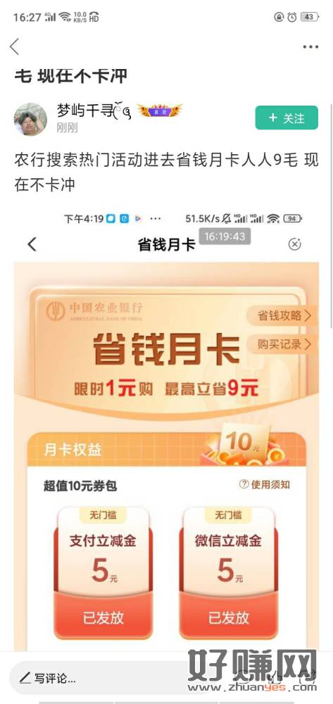 农行搜索热门活动进去省钱月卡人人9毛 现在不卡冲