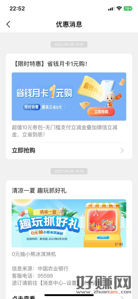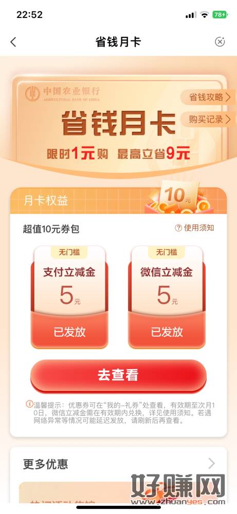 农行app右上角消息优惠那个点进去 一块钱省钱卡5微信立减加