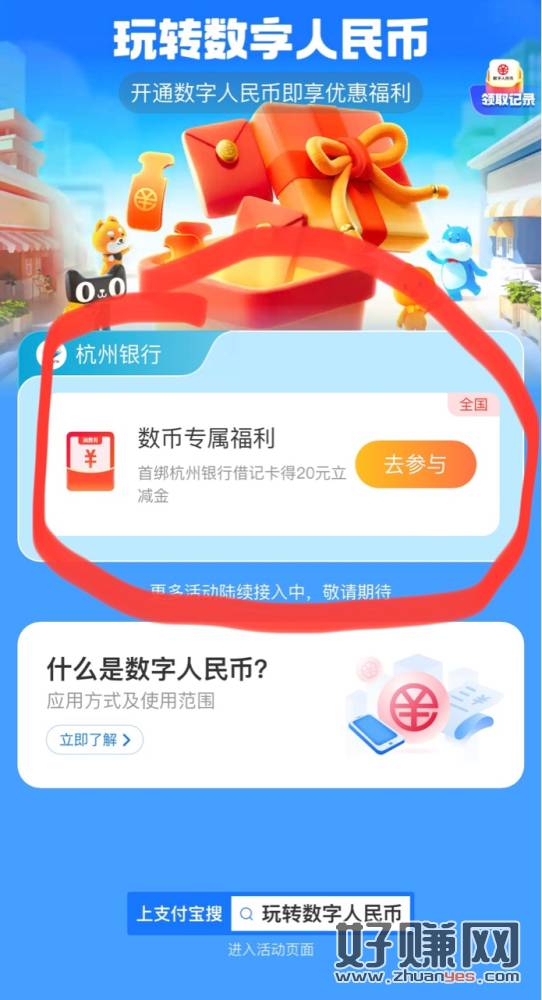 支付宝,数字人民币。活动范围全国 开通首绑杭州银行得20