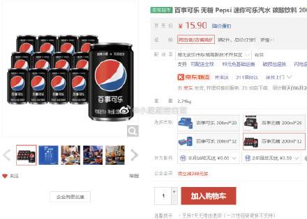 百事可乐 无糖 迷你可乐汽水 200ml*12听装,如有首购2礼金,买2件26.62
