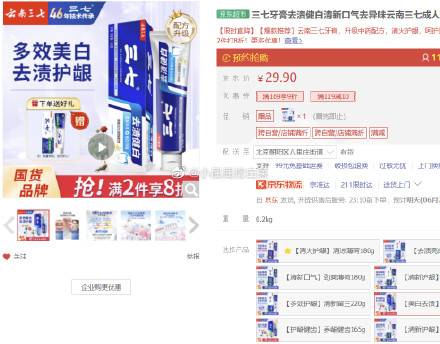 三七牙膏 去渍健白牙膏165g,买3件35.57,赠品 劲爽薄荷牙膏120g× 3