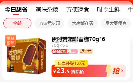 先领20券并加购收藏,伊利苦咖啡味冰淇淋70g*6支(今日疯抢-今日超省找到此商品23.9-加购买8件)