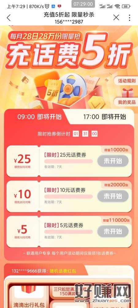 提前准备下 联通9点 50-25话费券和100-8充值卡
