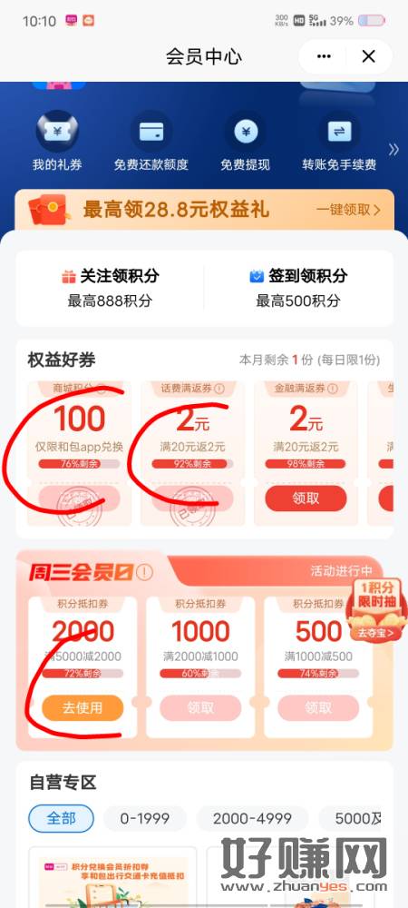 中国移动和包APP 限中国移动 会员中心 权益好券 星期三
