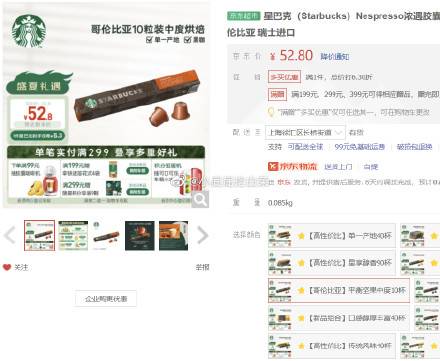 星巴克 Nespresso浓遇胶囊咖啡10粒,叠加评论里100券,买6件99.58