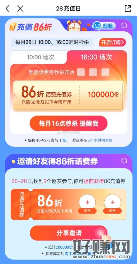 中国移动APP 搜索“28充值日” 86折话费充值券(限50元内)