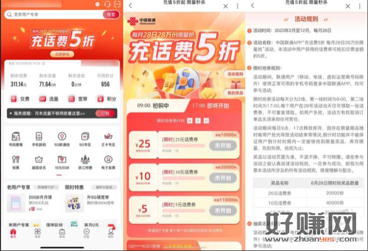 联通APP首页“充话费5折”->17点整抢5~25元话费满减券,共限量14万份