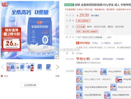 光明 全脂高钙奶粉袋装400g,如有首购2礼金,买2件30.2