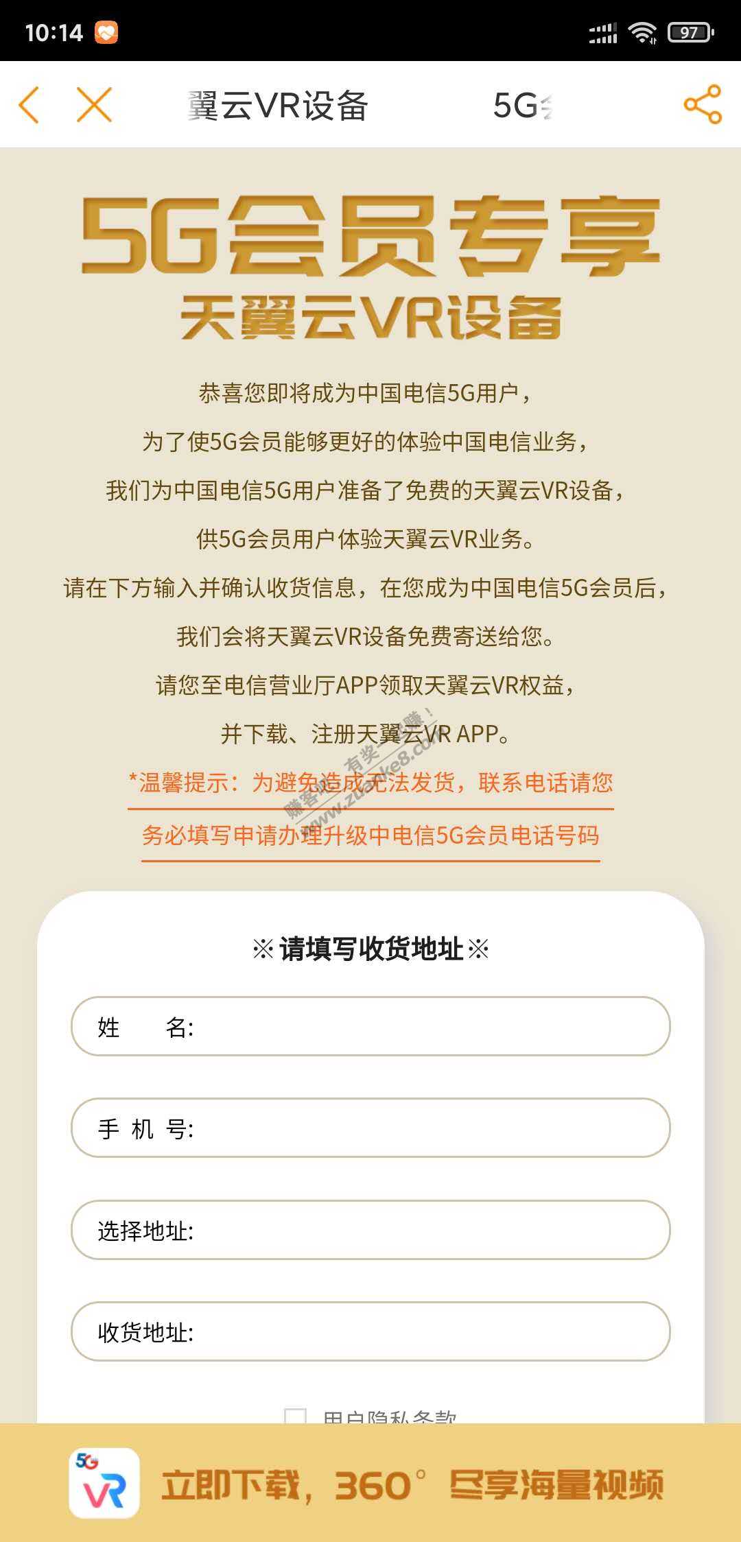 1.电信5G用户价值699VR头戴眼镜免费领