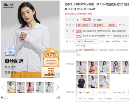 雪中飞 UPF50+防晒衣 透气冰丝薄外套,39