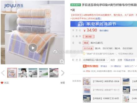 孚日洁玉 A类竹纤维毛巾3条装,买1件