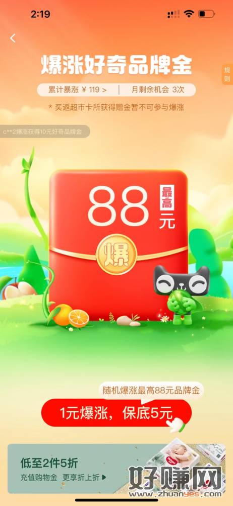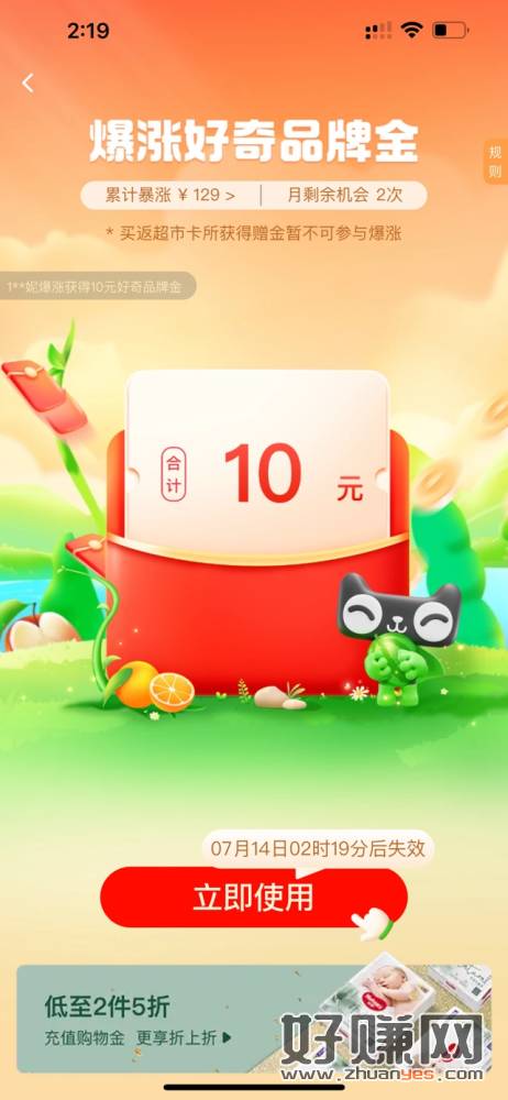 猫超暴涨保底5,基本是10,好奇品牌金的,到时候凑的时候可以买这个婴儿湿巾,看得上的去暴涨吧。暴涨的品牌金也可以手动补卡,试过了