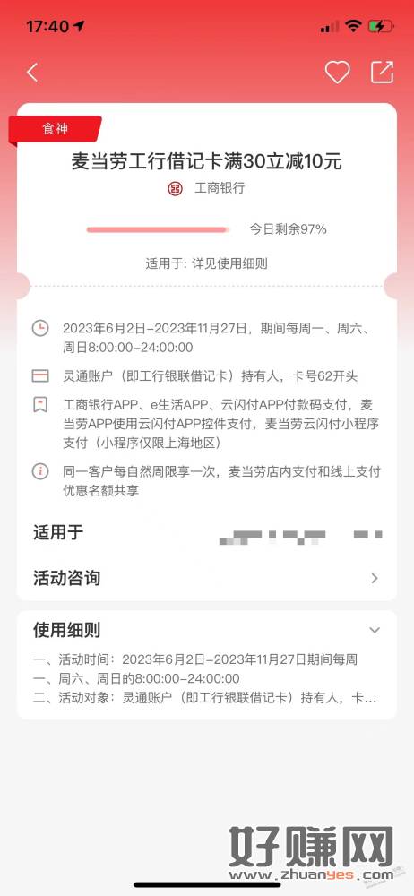 [ 云闪付 ] 麦当劳工行借记卡满30立减10元