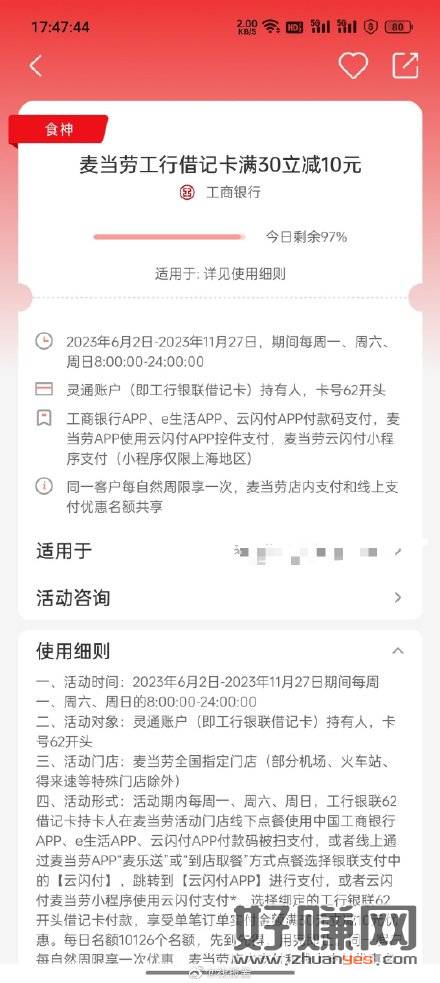 云闪付绑定工行卡,每周六周日周一有麦当劳30-10