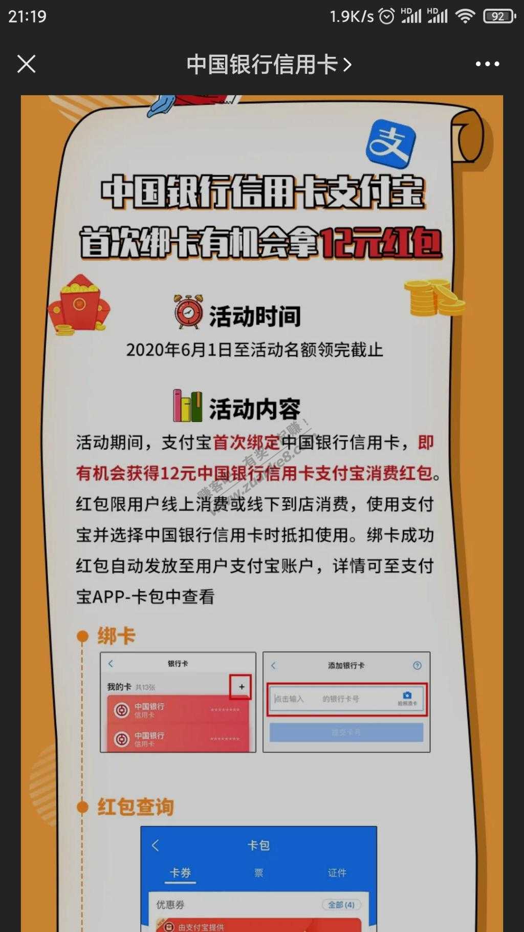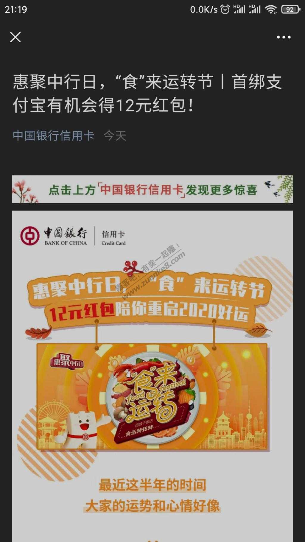 中行xing/用卡首绑得12元红包