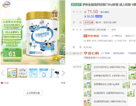 伊利全脂高钙奶粉听装700g,如有首购5礼金,plus会员32.71