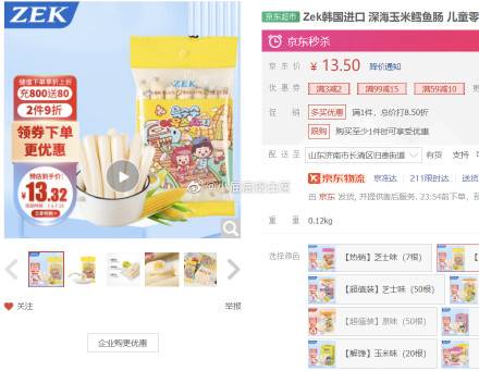 店铺180-89券,Zek韩国进口 深海玉米鳕鱼肠7根 105g