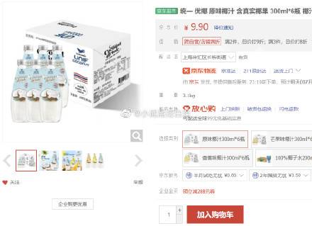 统一 优椰 原味椰汁 含真实椰果 300ml*6瓶,9.9,3件8折