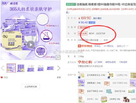 洁柔抽纸 棉柔感3层90抽面巾纸30包,部分地区2件5折,买2件59.9