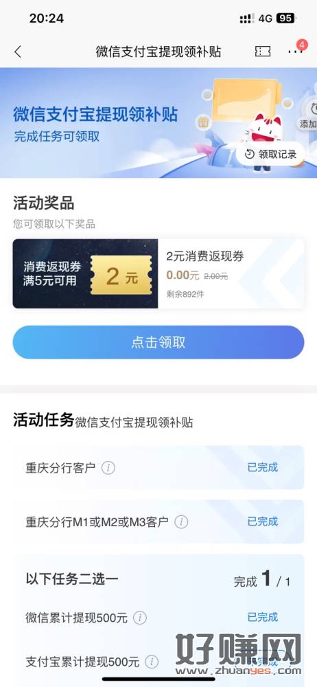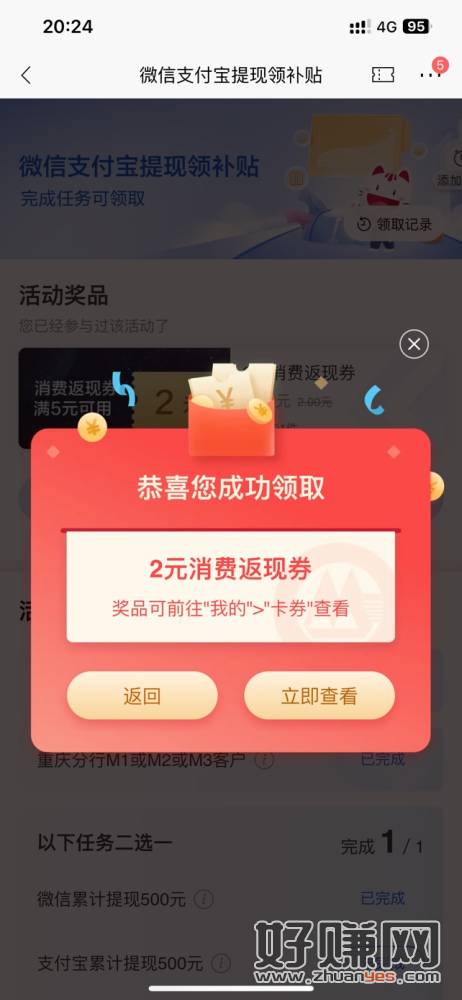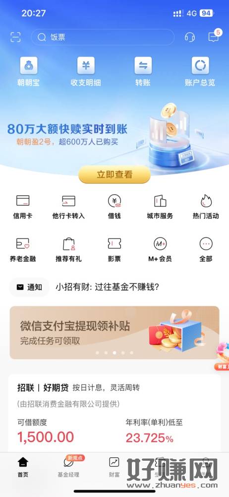 招商银行新活动,微信支付宝提现补贴,配合微信的提现券0手续费,满5返2,主页横幅有任务都去都去领,还有库存
