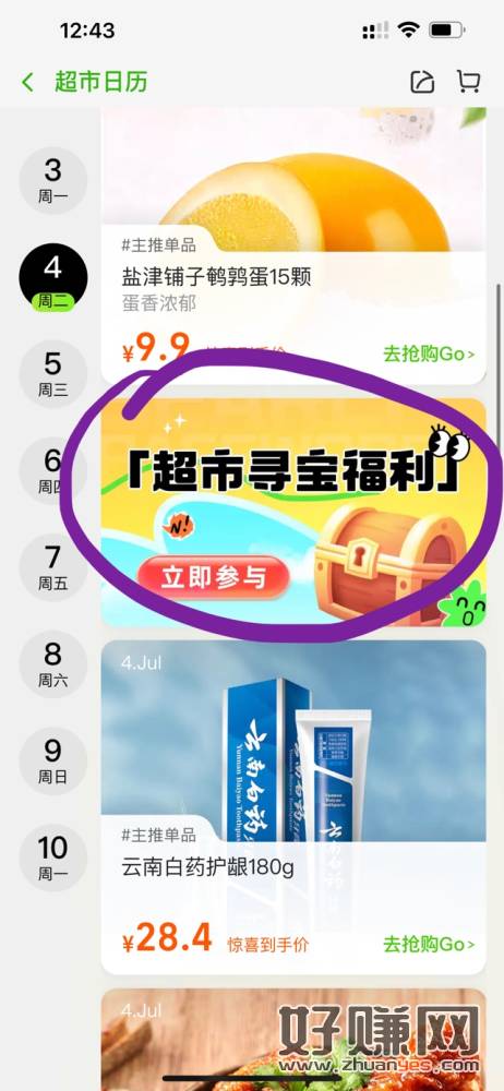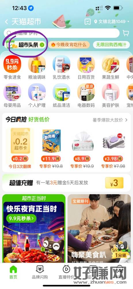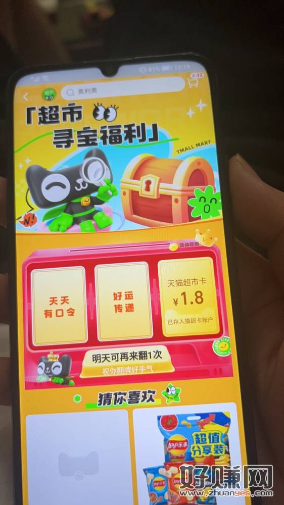 猫超首页,右上角签到位置,下拉,超市寻宝福利,几率1.8,0