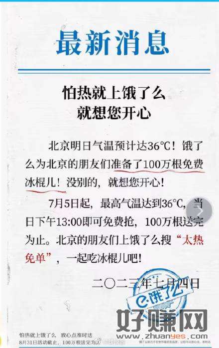 明天7月5日起当天气温达到36° 既可在下午13点免费抢雪糕
