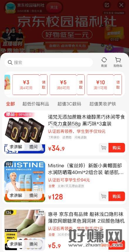 学生认证用户, 京东校园福利社 左下角购物袋 右滑可领4-3券/6-5券/11-10券