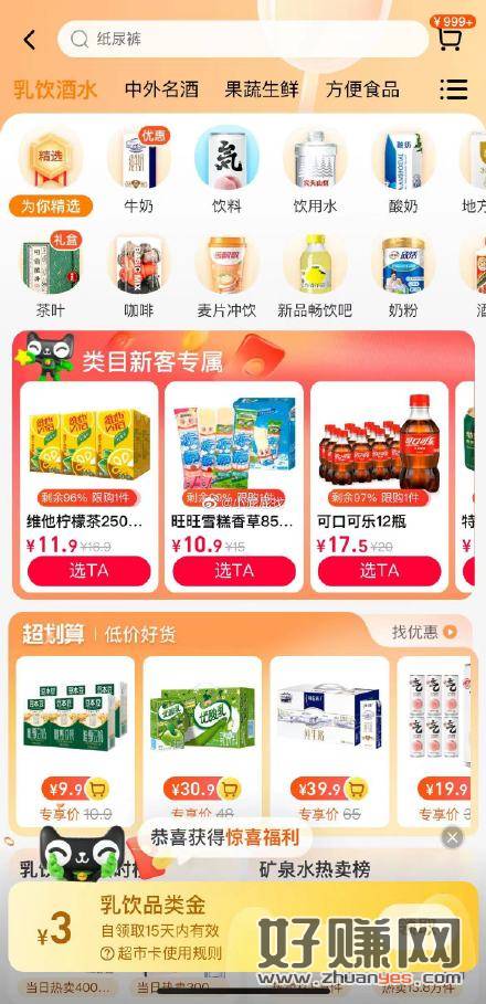 猫超首页-乳饮酒水-部分账号底部有弹2/3元乳饮品类金