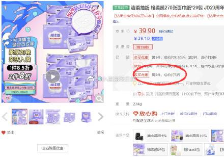 洁柔抽纸 棉柔感270张20包,北京地区2件5折,plus会员买3件53.35
