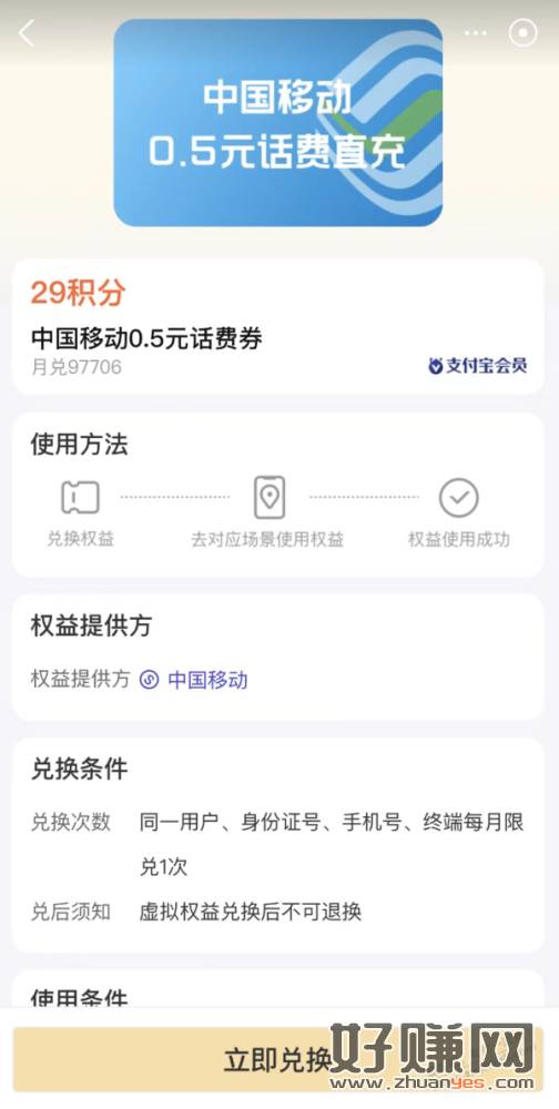 支付宝会员 29积分兑0.5元移动话费券
