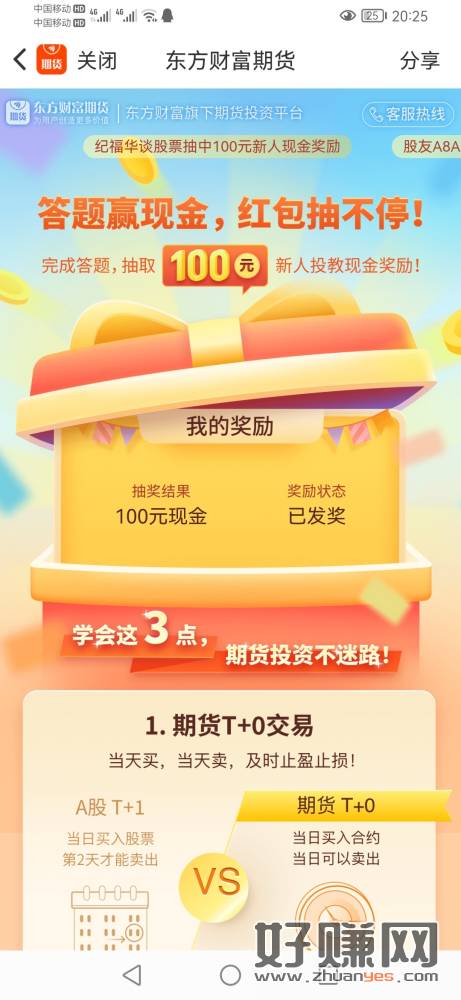 东方财富期货app活动中心答题抽100,抽到的开户就送到账8