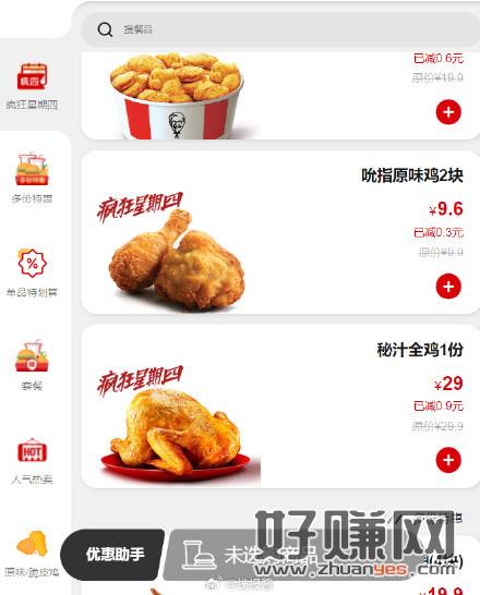 肯德基今天疯狂星期四,原味鸡2个9.9,扫码点餐9.6