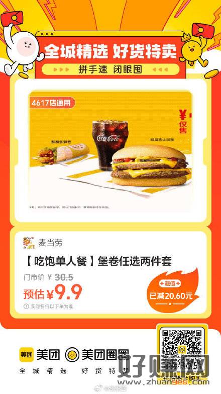 美团到店,麦当劳|[ 吃饱单人餐 ]堡卷任选两件,9.9