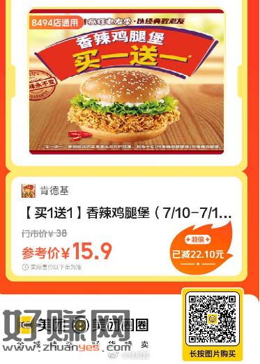 肯德基|香辣鸡腿堡,买1送1,15.9