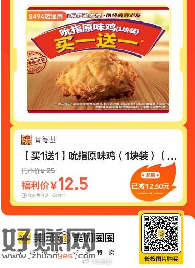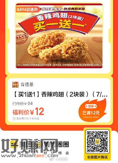 肯德基|香辣鸡翅香辣鸡翅,买1送1,12