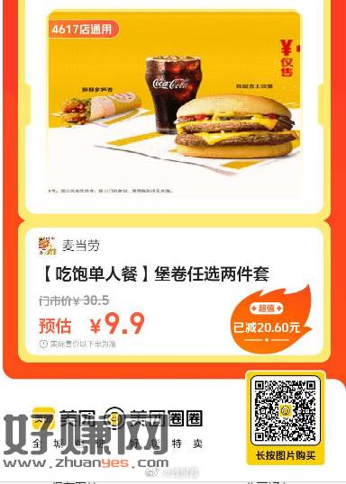 麦当劳|【吃饱单人餐】堡卷任选两件,9.9