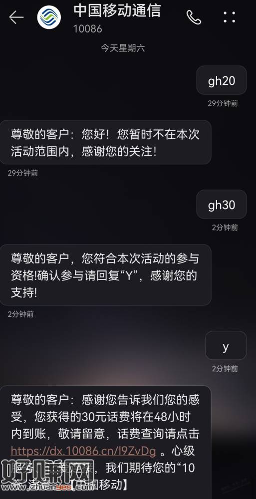 发送gh20到10086得了20块,我不行,但是后来试试gh30可以,大家可以试试,都不行的话或者试试发送gh10
