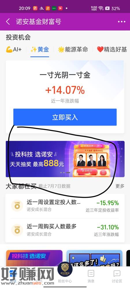 支付宝首页搜诺安基金财富号,进去点横幅这个。有小号的去拉小号。一个0.1元,我拉了三个。别傻傻走别人的码。走码他有钱,你进去了没有钱。只能拉人才有钱。