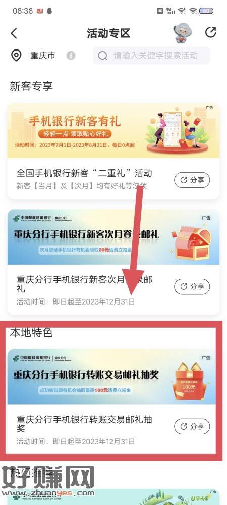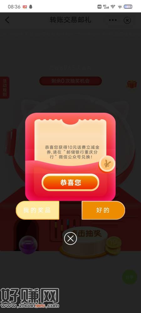 重庆邮政,转账交易那抽每天一次机会刚中10话费,要充20才能