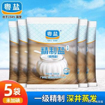 9.9,粤盐 无碘盐精制盐500g*5袋
