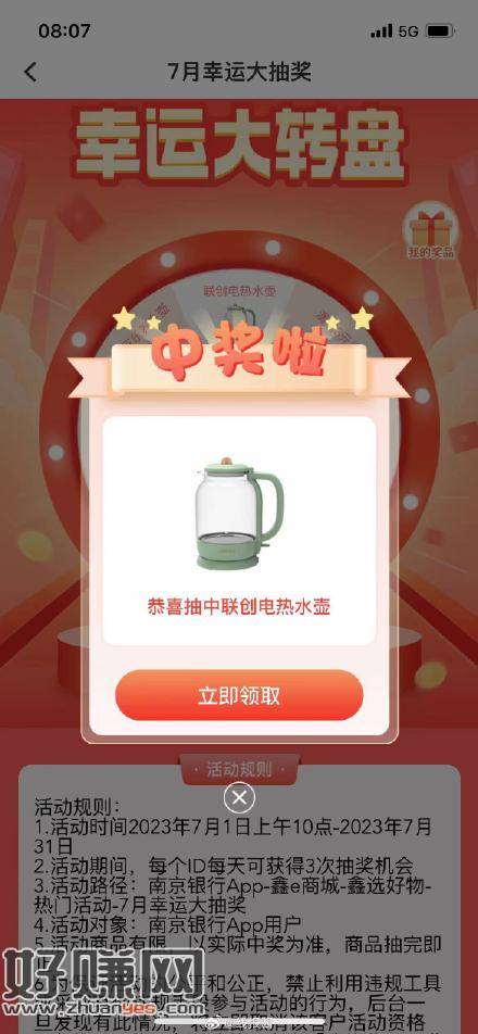 反馈 南京银行APP,鑫选好物进去下拉找到热门活动,再点天天抽奖,刚中水壶
