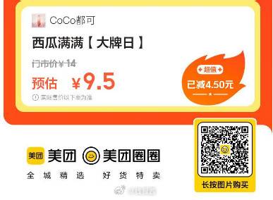 美团到店,CoCo都可|西瓜满满[ 大牌日 ],9.5