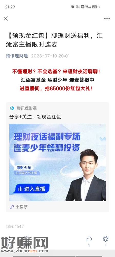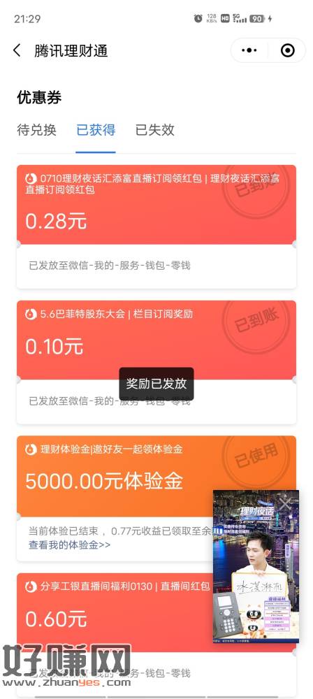 腾讯理财通直播预约加关注,必中零钱包中了要去卡券点立即领取才